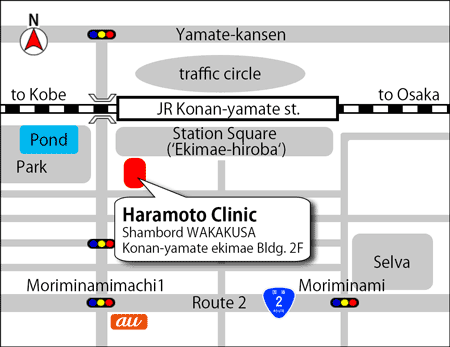 Our clinic is located in front of JR 'Konan-yamate' Station, within one minutes walk from there.